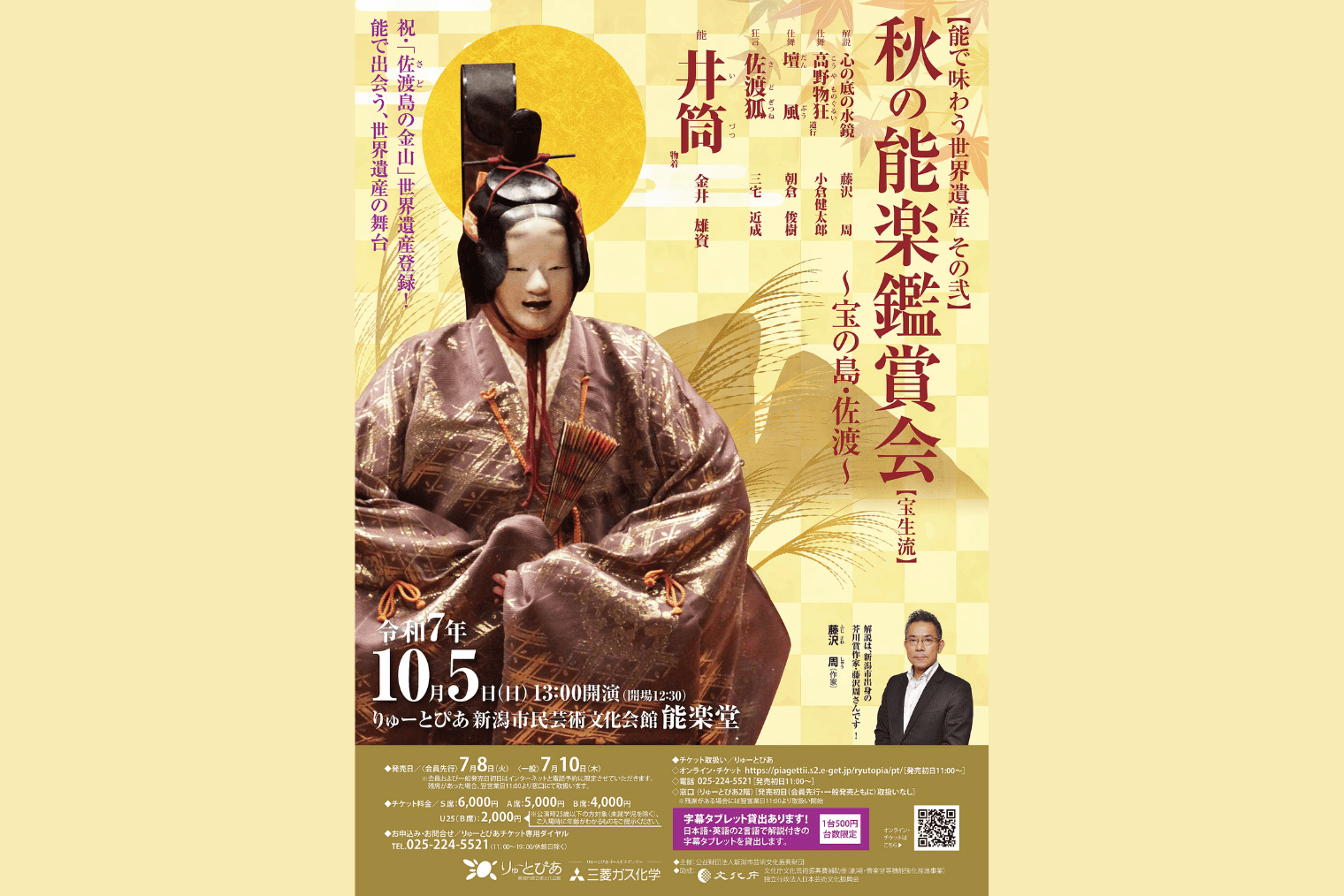 「佐渡島の金山」世界遺産登録を記念し、令和7年度の春と秋の鑑賞会では、世界遺産をテーマに能をお楽しみいただきます。秋の能楽鑑賞会では、佐渡で晩年を過ごした能の大成者・世阿弥の名作「井筒(いづつ)」のほか、佐渡と越後のお百姓のやり取りが楽しい狂言「佐渡狐(さどぎつね)」を上演します。