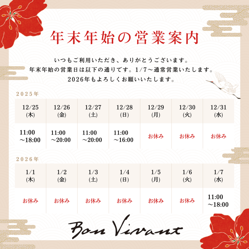 年末年始の営業日のお知らせです。12月29日(月)~1月6日(火)はお休みいたします。